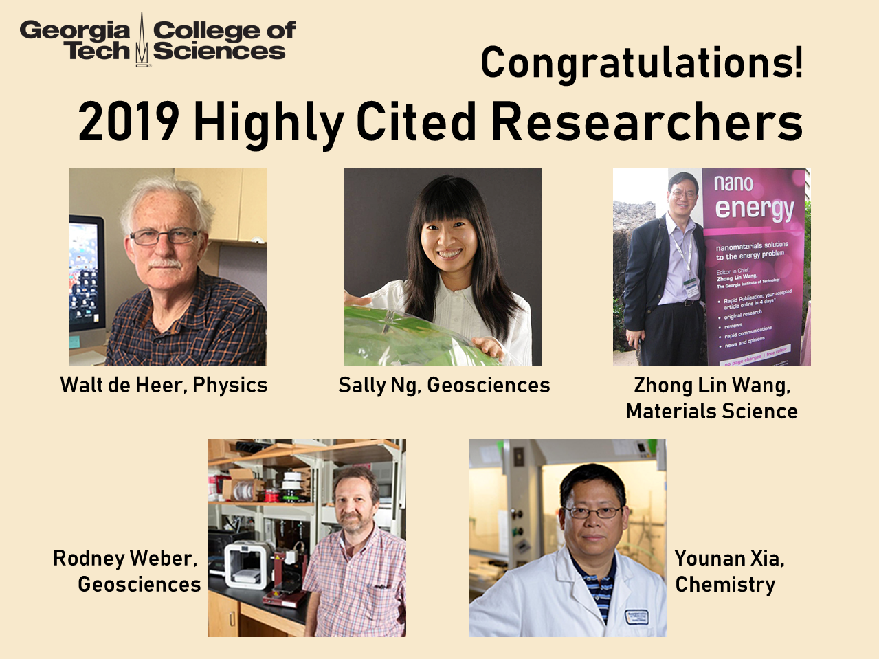 The College of Sciences has five scientists included in the 2019 Clarivate Analytics' Highly Cited Researchers list. They are among 12 Georgia Tech researchers chosen for the list, compiled annually by Clarivate's Web of Science group.